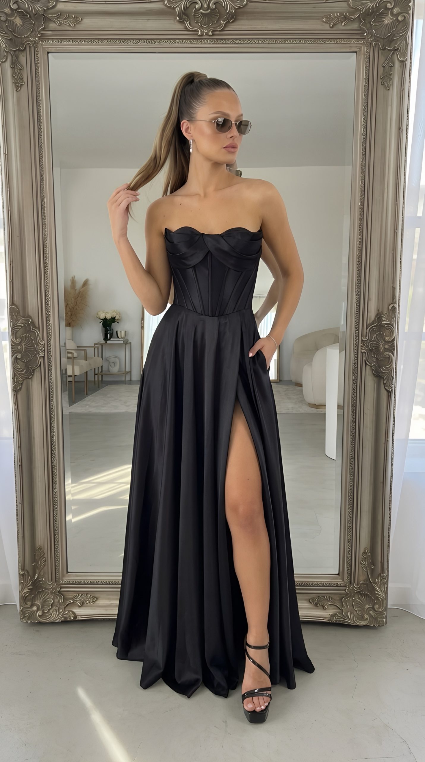 שמלת מקסי מחוך עצמות מבד סאטן מחטבת