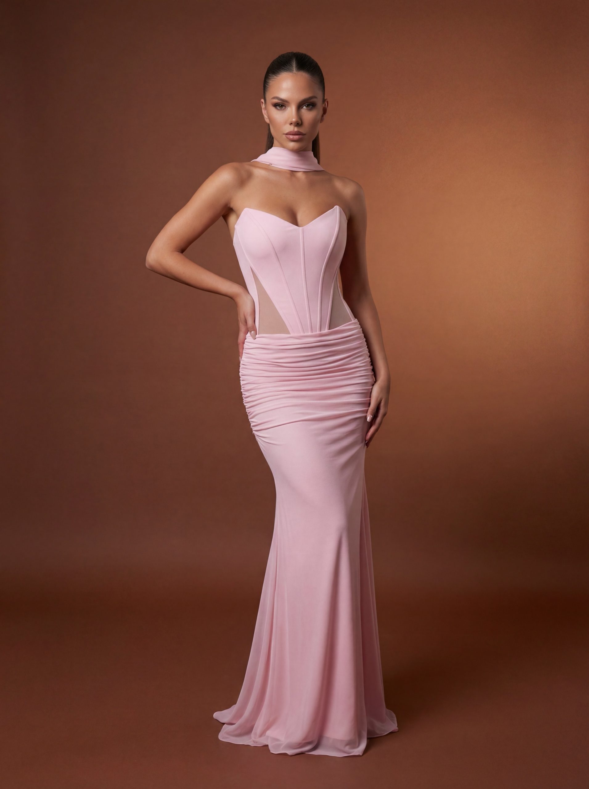 שמלת מקסי מבד שיפון בשילוב מחוך עצמות וי